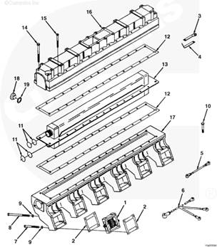 在工業(yè)用 康明斯發(fā)動(dòng)機上,格柵加熱器安裝在中冷器殼體和缸蓋之間。格柵加熱器提供暖空氣,從而控制發(fā)動(dòng)機冷起動(dòng)時(shí)的白煙。格柵加熱器的信息在本資料的第 13 節提供。不帶格柵加熱器的發(fā)動(dòng)機在中冷器殼體和缸蓋之間有一個(gè)隔套。