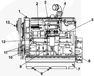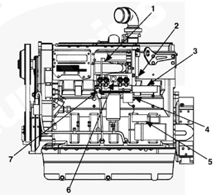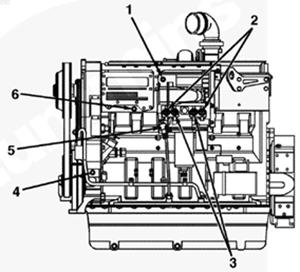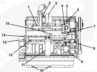1排氣歧管,2渦輪增壓器機油進(jìn)口,3渦輪增壓器,4節溫器殼通風(fēng)口,5節溫器殼,6發(fā)動(dòng)機冷卻液出口,7冷卻液溫度傳感器,8水泵,9冷卻液濾清器,10發(fā)動(dòng)機放油口,11組合式全流/旁通機油濾清器,12機油冷卻器,13飛輪殼,14發(fā)動(dòng)機生產(chǎn)序號(ESN),15渦輪增壓器機油回油口。
