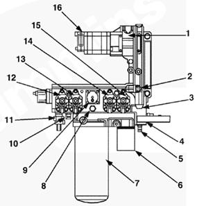 1加注旁通閥(內部),2 320-psi 壓力調節器,3 36-mc 濾清器濾網(wǎng),4燃油進(jìn)口管接頭/進(jìn)口濾清器殼,5快斷壓力鎖片 — 吸入側,6燃油加注泵,7燃油濾清器,8 250-psi 壓力調節器,9燃油切斷閥,10快斷壓力鎖片 — 壓力側,11燃油壓力傳感器,12前油軌執行器,13前正時(shí)執行器,14后正時(shí)執行器,15后油軌執行器,16燃油泵總成。