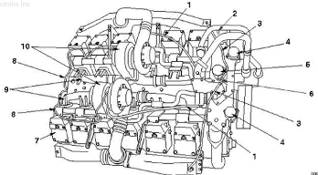 1渦輪增壓器冷卻液供應管,2中冷器進(jìn)水口溫度傳感器,3冷卻液排氣管連接式中冷器,4發(fā)動(dòng)機出水管接頭,5 LTA出水管接頭,6中冷器排氣管連接式發(fā)動(dòng)機,7搖臂室蓋,8渦輪增壓器機油供油管,9排氣歧管,10渦輪增壓器。