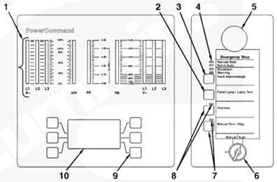 1數字 VAC 儀表板,2面板指示燈/指示燈測試按鈕,3故障確認按鈕,4遠程起動(dòng)、非自動(dòng)、停機、警告狀態(tài),5緊急停機按鈕,6 0/手動(dòng)/自動(dòng)開(kāi)關(guān),7手動(dòng)運行/停機按鈕指示燈,8運行按鈕指示燈,9顯示菜單選擇按鈕(6 個(gè)之中的 1 個(gè)),10圖形顯示器。