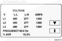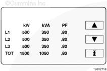 kW、kVA 和 PF 顯示發(fā)電機組的千瓦(kW)和千伏安(kVA)輸出(平均和單相以及電流方向)和有超前/滯后指示的功率因數。