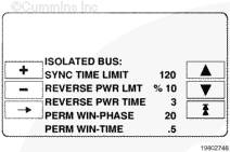 容許窗口時(shí)間 (PERM WIN-TIME):調整在 PowerCommand® 控制系統發(fā)出斷路器閉合信號前發(fā)電機組必須與系統母線(xiàn)保持同步的時(shí)間期限(單位:秒)??烧{整的范圍是 0.5 至 5 秒。對于隔離母線(xiàn)的建議值是 0.5 秒。(將控制系統調整為更小的同步檢查窗口或更長(cháng)的延時(shí)會(huì )造成同步時(shí)間延長(cháng)。)