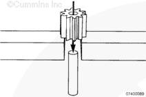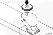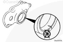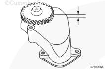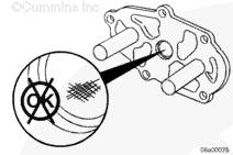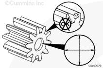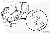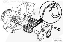 通過(guò)緩慢轉動(dòng)驅動(dòng)齒輪和檢查泵齒輪是否損壞來(lái)檢查機油泵能否繼續使用。如果機油泵內有零件損壞,則此泵必須大修或更換。有關(guān)大修的詳細信息,請參考《 QST30  大修手冊》(公告號 3666190)中的第 7 節。