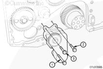 注: 檢查 O 形圈有無(wú)刻痕或切口,確保 O 形圈在凹槽中沒(méi)有扭曲。使用 Lubriplate™ 105 馬達組裝潤滑脂或等同物潤滑 O 形圈和機油泵凹槽。將一個(gè) O 形圈安裝到機油泵的凹槽中。潤滑脂將使 O 形圈固定在凹槽中。將機油泵安裝到缸體上。將一個(gè)長(cháng)螺栓 (1) 和兩個(gè)短螺栓(2、3)安裝到機油泵中。擰緊所有螺栓。