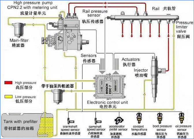 Ø 接線(xiàn)故障為:線(xiàn)束由于振動(dòng)、磨損等原因,連接斷開(kāi)或直接搭在缸蓋上與地短接。ECU會(huì )報錯。 3.1 噴油器出現故障 Ø 怠速不穩,聽(tīng)柴油機聲音異常 Ø 利用斷缸法或高壓油管觸感法判斷 Ø 利用故障診斷儀做加速測試判斷 3.2 水溫、機油溫、進(jìn)氣溫度過(guò)高 Ø 水溫、機油溫、進(jìn)氣溫度過(guò)高時(shí),ECU會(huì )進(jìn)入過(guò)熱保護功能,限制發(fā)動(dòng)機功率。造成水溫高的原因及排除方法 ①水箱水面過(guò)低:檢查有無(wú)漏水處,加水 ②風(fēng)扇轉速過(guò)慢或不轉:檢查風(fēng)扇傳動(dòng)部件 ③水箱堵塞:檢查水箱,清理或修復 ④水泵皮帶松弛:按規定調整張緊力 ⑤水泵墊片損壞,水泵葉輪磨損:檢查并修復或更換 ⑥節溫器故障:更換 ⑦水管密封件損壞,漏入空氣:檢查水管、接頭、墊 片等,更換損壞件 Ø 在排除故障之前,首先要排除傳感器及儀表的反映失真情況 Ø 機油溫過(guò)高的原因及排除方法 ①油底殼油面低或缺油:檢查油面及漏油處,修復并加油 ②水溫高:檢查上述造成水溫高的原因并排除之 ③機油冷卻器流通不暢:檢查并清理 Ø 進(jìn)氣溫度過(guò)高的原因及排除方法 檢查中冷器的散熱能力 3.3 同步信號出錯 出現該問(wèn)題時(shí),一般是一個(gè)傳感器的信號失效??梢圆榭撮W碼表查找具體原因 排除方法同1.4 3.4 流量計量單元故障 流量計量單元是控制軌壓的執行機構,安裝在高壓油泵上,它出現問(wèn)題以后,高壓油泵會(huì )以最大的能力向共軌管供油,此時(shí)共軌管上的泄壓閥一般會(huì )打開(kāi),柴油機會(huì )有“咔咔”的噪音。軌壓傳感器出現問(wèn)題也會(huì )有類(lèi)似的現象。 Ø 排除方法:檢修線(xiàn)路,確認是流量計量單元或軌壓傳感器故障,通知辦事處處理 3.6 傳感器故障 進(jìn)氣壓力傳感器是ECU用來(lái)估算進(jìn)氣量的傳感器(安裝在進(jìn)氣管上),水溫傳感器是用來(lái)判斷發(fā)動(dòng)機熱負荷的傳感器(安裝在出水管上),軌壓傳感器是用來(lái)檢測共軌管的燃油壓力(安裝在共軌管上) Ø 排除方法: 檢查進(jìn)氣溫度壓力、水溫、軌壓傳感器,看接插件是否牢靠 注:出現3.1、3.3、3.4、3.5、3.6時(shí),柴油機進(jìn)入“跛行回家”模式。 故障四:發(fā)動(dòng)機始終運行在1000轉 此時(shí)油門(mén)失效:ECU通過(guò)踏板電位計給出的信號來(lái)判斷負荷,當踏板出故障時(shí),出于安全考慮,ECU會(huì )控制柴油機會(huì )自動(dòng)回到1000轉的怠速。 Ø 電子油門(mén)踏線(xiàn)松脫或接錯,重新拔插或檢查油門(mén)接線(xiàn)是否正確,重新接線(xiàn) Ø 電子油門(mén)接插件進(jìn)水,用工具把接插件吹干再起動(dòng) 注意:更換油門(mén)時(shí),需要同一型號的油門(mén)。 故障五:柴油機怠速游車(chē) 柴油機游車(chē)的原因及排除方法: ①?lài)娪推鞴ぷ鞑徽#簷z查各缸噴油器及線(xiàn)束 ②具有車(chē)速傳感器的整車(chē),停車(chē)時(shí)有車(chē)速信號 輸入:檢查車(chē)速表及車(chē)速傳感器信號及接線(xiàn) ③燃油質(zhì)量差含水或蠟質(zhì):清洗燃油系統,更換燃油濾清器 ④燃油低壓油路漏入空氣:檢查油管及接頭密封性,排除空氣 ⑤噴油嘴霧化不穩定:檢查并修復 注:①由于水溫低引起的怠速上升是ECU正常的功能 ②有其他負載時(shí)(如打開(kāi)空調),怠速會(huì )自然提升100轉 說(shuō)明 Ø 濰柴動(dòng)力國三系列柴油機采用Bosch公司的第二代高壓共軌系統。高壓共軌系統對油路(包括低壓油路和高壓油路)要求較高,很多問(wèn)題都是由油路問(wèn)題引起的 Ø 整車(chē)線(xiàn)束問(wèn)題也是主要的故障源出現故障時(shí),應先考慮此