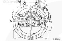 緩慢轉動(dòng)康明斯ISX15 CM2250發(fā)動(dòng)機曲軸。記錄在 9 點(diǎn)、12 點(diǎn)和 3 點(diǎn)位置時(shí)的讀數,并作為 (a)、(b) 和 (c) 記入同心度工作表。6 點(diǎn)鐘位置重新檢查零位。