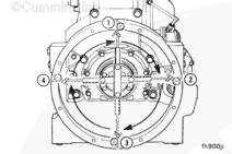 出廠(chǎng)時(shí)康明斯ISX15 CM2250發(fā)動(dòng)機飛輪殼通過(guò)兩個(gè)環(huán)形定位銷(xiāo)固定在缸體上。如果飛輪殼被拆卸,可在環(huán)形定位銷(xiāo)就位的情況下進(jìn)行重新安裝,但必須根據下列對準步驟檢查對準情況。