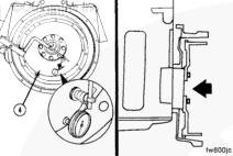 將千分表的觸頭對著(zhù)飛輪端面安裝,盡可能靠近外徑,以檢查端面(4)的跳動(dòng)量。