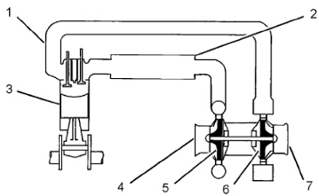 (1) 排氣岐管 (2)后冷器(3)發(fā)動(dòng)機氣缸 (4)進(jìn)氣口 (5)渦輪增壓器壓縮機葉輪(6)渦輪坩壓器堝輪葉鞋(7)排氣出口