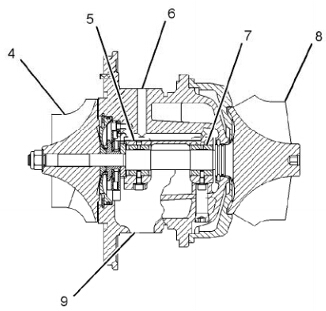 渦輪增壓器中的軸承(5)和軸承(7)使用發(fā)動(dòng)機機油進(jìn)行壓力潤滑。機油經(jīng)由進(jìn)油管被輸送到上部的進(jìn)油口(6)。機油繼而經(jīng)由中段內的油遁潤荷軸承。機油從底部的出油口(9)流出。然后機油通過(guò)回油管流回曲軸箱。