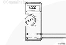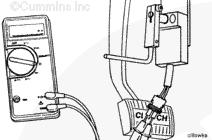 調整萬(wàn)用表以便測量電阻。然后將一根測試導線(xiàn)插入 OEM 線(xiàn)束接頭的離合器踏板位置開(kāi)關(guān)信號觸針。將另一根測試導線(xiàn)插入康明斯離合器踏板位置開(kāi)關(guān)回路觸針。將鱷魚(yú)夾與萬(wàn)用表表筆相連。