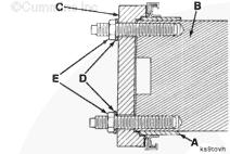 將安裝工具 (C) 的擴孔端置于雙頭螺釘上,并且與承磨襯套對準,與曲軸端垂直。將墊圈(D)和螺母(E)安裝到螺紋雙頭螺釘上。