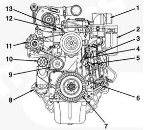 1進(jìn)氣接頭,2燃油濾清器 3發(fā)動(dòng)機控制模塊 (ECM) 4機油壓力傳感器 5凸輪軸轉速/位置傳感器 6曲軸轉速/位置傳感器 7減振器 8起動(dòng)馬達 9水泵 10皮帶張緊器 11充電機 12出水口接頭 13冷卻液溫度傳感器。
