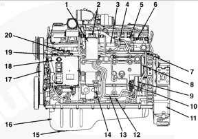 1燃油濾清器 2燃油濾清器座 3濾清器支架 4燃油連接塊接頭 5燃油油軌 6燃油油軌壓力傳感器 7從高壓泵、噴油器和燃油8油軌至燃油連接塊的回油 9附件驅動(dòng)裝置蓋 10燃油泵 11高壓供油管(泵至油軌) 12飛輪殼 13從齒輪泵至燃油濾清器的燃油供應 14從燃油濾清器至高壓泵的燃油供應 15機油油位計管 16放油塞 17油底殼 18風(fēng)扇驅動(dòng)皮帶 19ECM 20ECM 支架