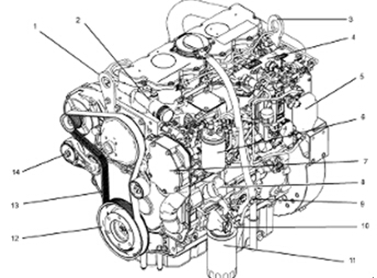 (1)前吊耳(2)出水口(3)后吊耳(4)燃油歧管(油軌)(5)電子控制模塊(6)燃細細濾器(7)水泵(8)機油加注口(9)機油表(10)機油取樣閥(11)機油濾清器(12)曲軸皮帶輪(13)傳動(dòng)皮帶(14)皮帶張緊裝置