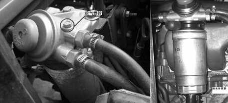 排放燃油系統中的空氣時(shí),應該先旋轉燃油濾清器頂部的放氣螺栓(上圖所示),將其松開(kāi),按壓手油泵,直到從放氣孔中流出無(wú)空氣的燃油。緊固放氣螺塞,手油泵集成在濾清器上端。