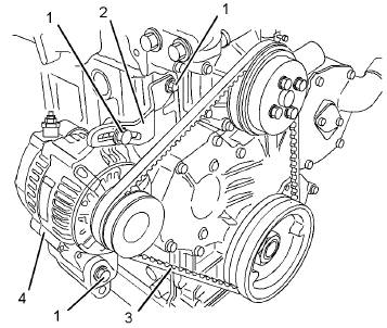 2. 移動(dòng)交流發(fā)動(dòng)機(4)以增加或降低皮帶張緊度。檢查皮帶張緊度時(shí),應在兩個(gè)皮帶輪中間的地方施加45 N (10 lb ft)的力。調整正確的皮帶將下垂10 mm (0.39 inch)。