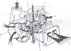 • 機器的排氣經(jīng)4進(jìn)入,膨脹驅動(dòng)渦輪機,給壓縮機提供動(dòng)力,經(jīng)13排入大氣。燃燒的空氣經(jīng)過(guò)濾器從12進(jìn)入壓縮機,經(jīng)10送至散熱器冷卻后送入機器。