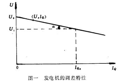 在穩定運行情況下,發(fā)電機端電壓U與該電機無(wú)功電流I Q之間的關(guān)系U=f(IQ)稱(chēng)為發(fā)電機的調節特性。它可以近似用一條直線(xiàn)代表,如圖一所示。