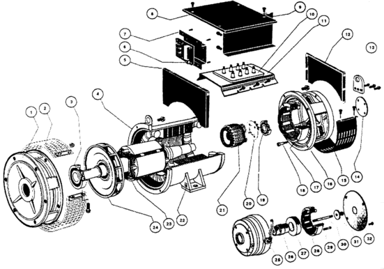 1—前端蓋;2—出風(fēng)蓋板;3—軸承;4—定子;5—端子箱側板;6—電壓調節器;7—調節器支架;8—端子箱頂蓋;9—端子箱前后板;10—接線(xiàn)板;11—接線(xiàn)板支架;12—端子箱側板;13—吊攀;14—軸承蓋;15—進(jìn)風(fēng)蓋板;16—后端蓋;17—勵磁定子;18—勵磁定子固定螺栓;19—軸承;20—旋轉整流器;21—勵磁電樞;22—接地牌;23—轉子;24—風(fēng)扇;25—永磁機機殼;26—永磁機轉軸;27—永磁機轉子;28—永磁機定子;29—永磁機定子固定螺栓;30—永磁機轉子固定螺栓;31—墊圈;32—永磁機蓋板