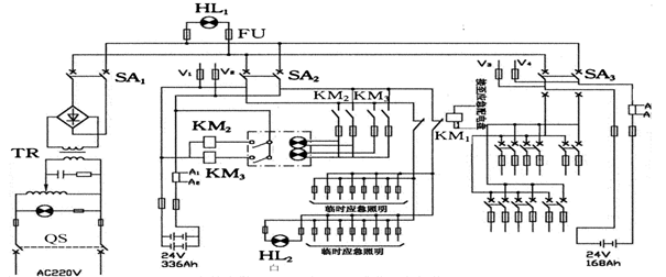 在每一個(gè)充電回路應設有防止逆流的逆電流繼電器或二極管,當主應急電網(wǎng)都失電時(shí),接觸器ZC1線(xiàn)圈失電,常閉觸頭閉合,直接向小應急用電設備供電,其余用電設備分別利用開(kāi)關(guān)送電。