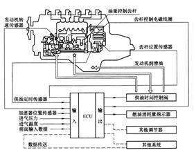 ECU根據加速踏板位置傳感器信號(即負荷信號)和柴油機轉速信號,并參考供油齒條位置、冷卻液溫度、進(jìn)氣壓力等傳感器信號,按內存控制程序計算供油量和噴油提前角控制參數值,再通過(guò)ECU中行程或位置伺服電路,使電子調速器內的線(xiàn)性螺線(xiàn)管控制噴油泵供油齒條的行程或位置。