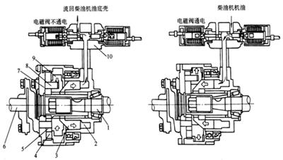 1 – 凸輪軸 2 – 液壓腔 3 – 液壓活塞 4 – 大偏心輪 5 – 小偏心輪 6 – 驅動(dòng)軸 7 – 驅動(dòng)盤(pán) 8 – 滑塊銷(xiāo) 9 – 滑塊 10 – 電磁閥