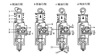 1-凸輪 2-柱塞 3-回位彈簧 4-高壓腔 5-電磁閥針閥 6-電磁閥閥腔 7-進(jìn)油通道 8-回油通道 9-線(xiàn)圈 10-低壓腔