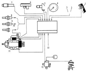 1 – 轉速表 2 – 故障指示燈 3 – 供油齒條位置傳感器 4 – 柴油機 5 – 噴油泵 6 – 正時(shí)傳感器 7 – 正時(shí)控制閥 8 – 轉速傳感器 9 – 正時(shí)控制電磁閥 10 – 冷卻液溫度傳感器